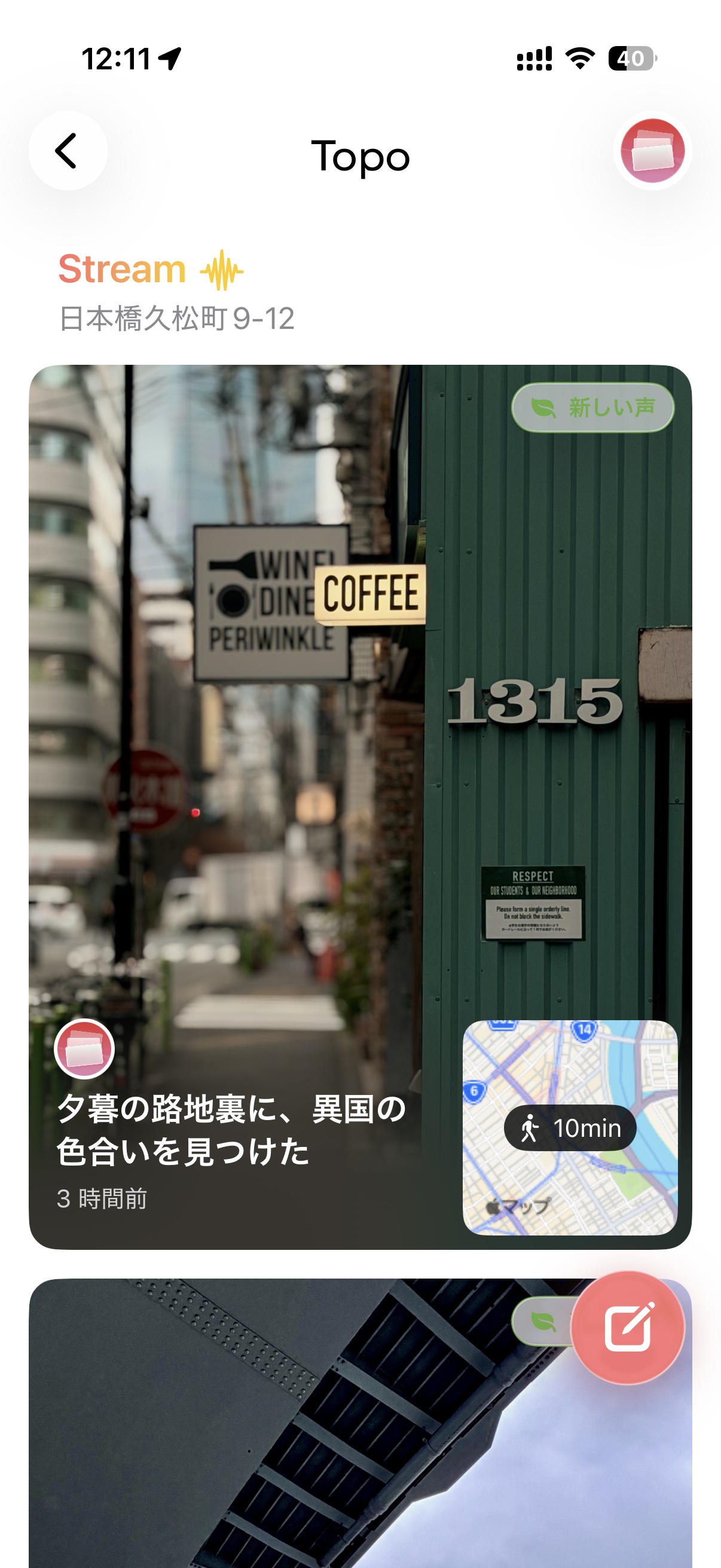Topoを開くだけで、周囲の街の変化がカードで見えてきます。マップを動かすと、いつでも好きな場所の情報に切り替えられます。
